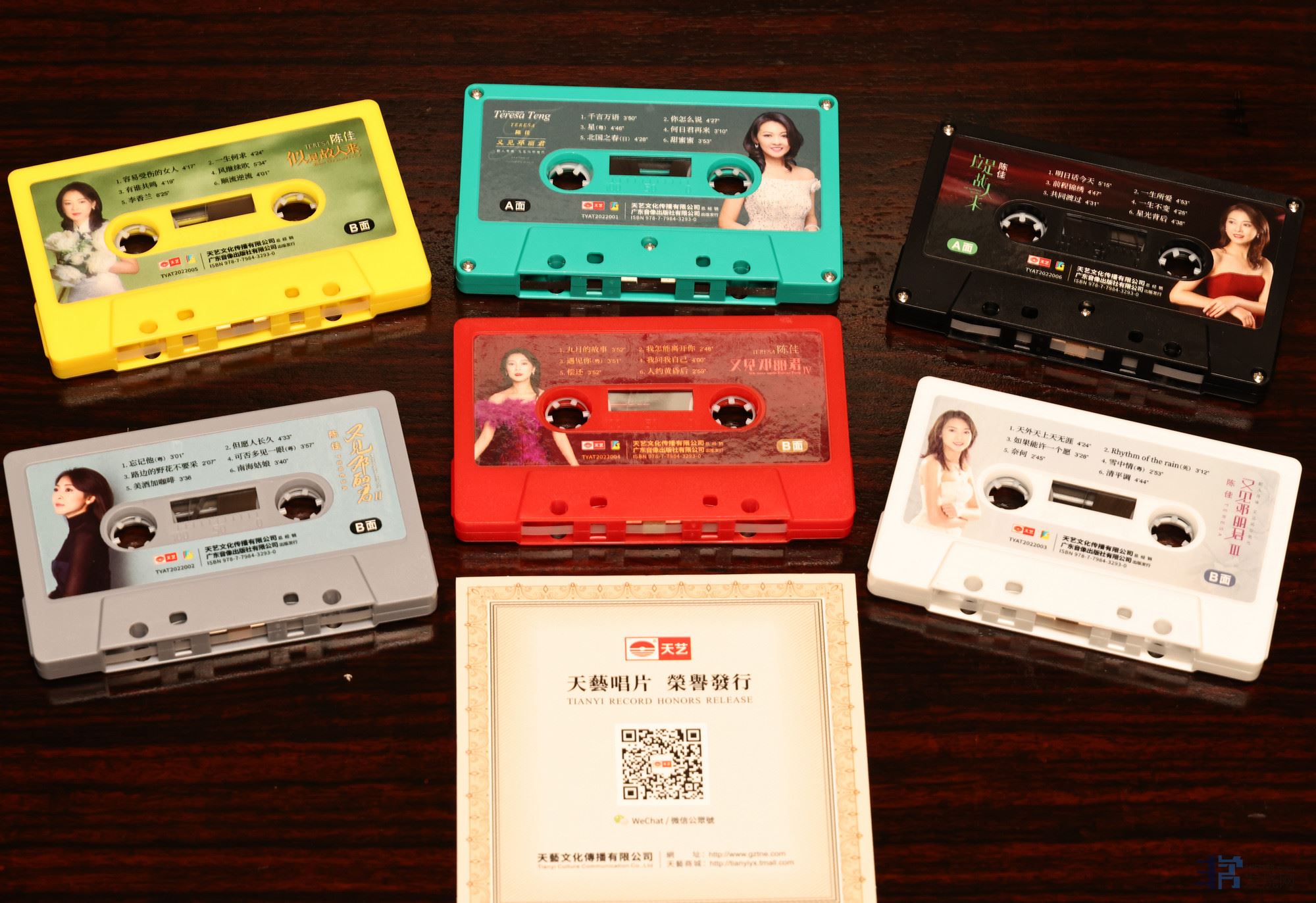 天艺唱片这套《典藏版磁带套装》一共包括了6款陈佳的个人专辑,分别是《又见邓丽君》系列4款,《故人来》系列2款。其中包括:《又见邓丽君》、《又见邓丽君Ⅱ》、《又见邓丽君IⅡ》、《又见邓丽君IV》、《似是故人来》、《应是故人来》。