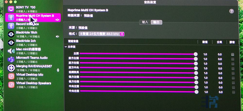 为了分享研究心得,同时推广沉浸式多声道音乐,黄旭恒在去年 TAA 音响展时还特地找了一间展房,办了好几场多声道音乐示范体验会,现场就是用 Mac Mini 计算机和 Merging AD/DA 接口,搭配 NuPrime 多声道纯后级,驱动多支很普通的喇叭,组成一套 Dolby Atmos 多声道系统。黄旭恒对于体验会的成果,用“雷声大,雨点小”来形容。当时来参加体验会的都是他邀请来的资深发烧友,两声道多声道的都有,每个人对播出的效果都非常惊艳,但,当大家一看到投影画面秀出的 Merging 操作接口,瞬间无语,因为实在太复杂了,这是专业录音师在用的东西,一般发烧友恐怕难以学会,而且 Merging 可不便宜,并不是普罗大众能负担的器材。