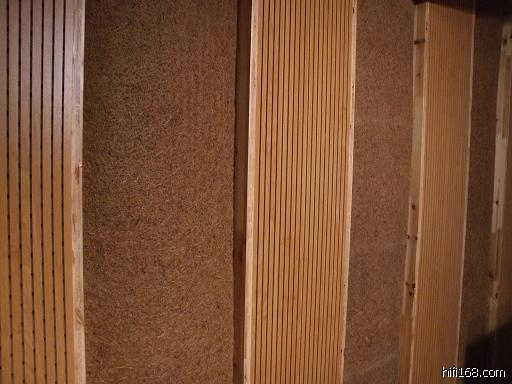 吸音扩散体:俩侧间隔设微孔吸音板,内填无纺布包裹5CM厚玻璃棉,间隔的空挡处设置3CM后棕垫子,俩侧后方俩个碟架,顶上12块大小不一(平均55X70)10CM厚方格,内填10CM厚无纺布包玻璃棉。后墙是大书架。地面3平米羊毛毯。170X80X20二次余数活动扩散板三块,放在前墙。