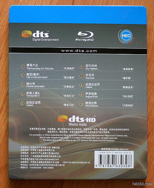 这张《DTS蓝光高清演示碟2010中文版》是由DTS公司与华录文化产业有限公司合作出品,全碟盒共有十套片段,包括国产电影、荷里活电影、动画、欧洲电影及纪录片,其中三分之一的片段配有dts-HD MA 7.1声道音效,其余片段则为DTS-HD MA 5.1音效,备有英文及简体中文字幕,BD演示碟本身属于全区码规格,因此可以在任何区码的BD器材上播放。