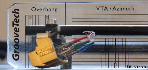 这个到现在我也没太搞懂是作什么用的,或者怎么调。刘文中说,这就是面对唱头时,看唱头正不正。但是我觉得这个说Azimuth还差不多。从资料中看,应该是把唱头对着规尺,把针尖放到规定的针尖点上(这个也很难),然后把唱头的四边与规尺里的横线和直线对准。但是这个真的是很难搞,我费了好大力只能搞个大概。
