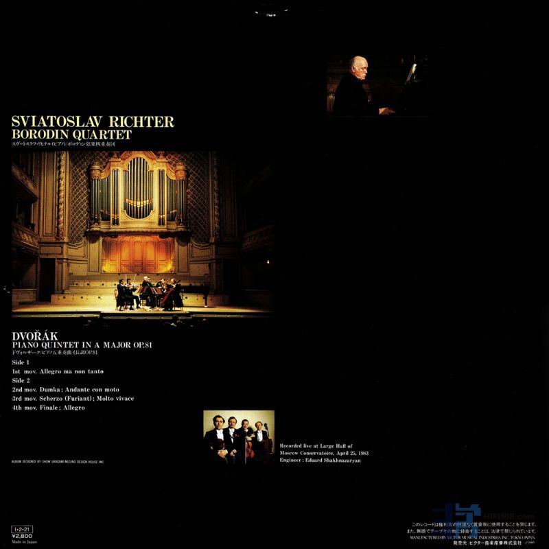 相对于有些人喜欢一开始便用大动态大编制的曲目来和初识器材直球对决,我个人更喜欢先以小编制的作品和初识的器材交交心...( 如果心都交不到,能唱得大声又如何呢?);下图南方珍爱的德弗乍克第二号钢琴五重奏之黑胶唱片的封面及封底,此版本为 1983 年 4 月 25 日于莫斯科音乐院大厅的音乐会实况录音,由俄国知名的鲍罗定弦乐四重奏搭配俄国钢琴家李希特共同演出,原盘由俄国 Melodiya 唱片发行,我买到的是该公司授权给日本 VICTOR 发行的版本,封面上还注明为数位录音呢!( 在这之前,这对组合至少还合作录过作曲家布拉姆斯、舒伯特、萧士塔高维契等人的钢琴五重奏,而更早的 1982 年李希特曾与鲍罗定弦乐四重奏搭档在欧洲巡回演出,同年 6 月于布拉格音乐节上演出本曲,并为 PHILIPS 留下的录音。)