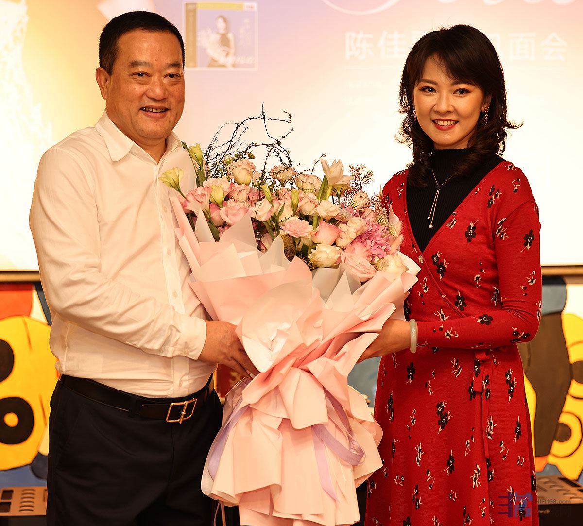 声雅何总向陈佳送上鲜花庆祝活动成功。