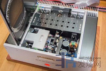 驱动输出的电源输出还带有26个2700μF/160V的高音质电容器,构成一个高速电源(在上面的照片外壳内部,电容器安装在黑色的盖子下面)。大量高质量的电源占据了机柜的一个角落。