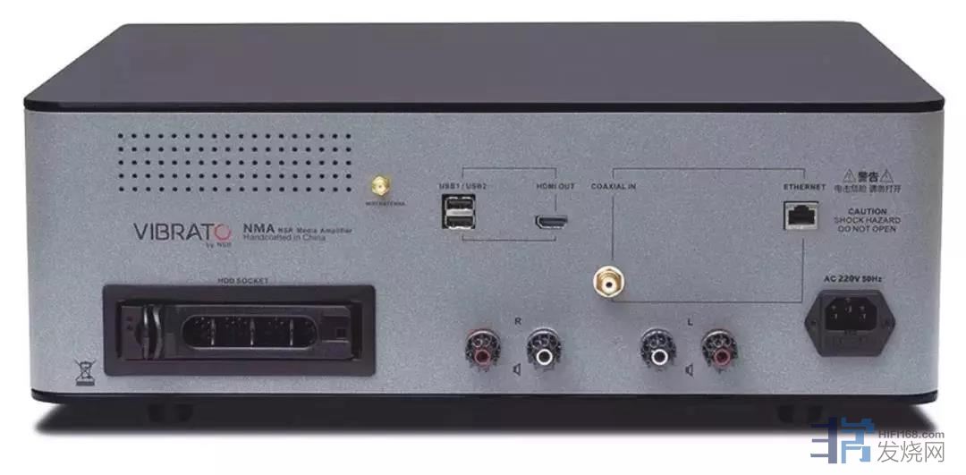 再看看这台NMA三合一功放,何为三合一呢?其实,NMA是一台集数码播放器、解码、AB类合并机于一体的 All in One合并式功率放大器,可使用USB移动硬盘、支持3.5寸的硬盘直接插入机内进行播放,同时还有无线网络和有线网络连接,可方便读取局域网当中的共享内容。此外更提供一组同轴输入,方便外接CD或蓝光音源,同时带有HDMI图形界面输出,一个遥控/APP即可实现从播放音乐到驱动音箱的所有功能,省却了多台机器之间的接线烦恼,也更便于操作。