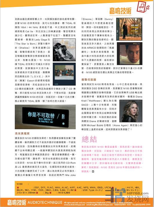 像播放Lady Gaga在「The Star is BornJ原声大碟中的〈Shallow〉,效果直逼CD 碟,歌声同样表现了穿透力,甚至喉咙底发声那份质感都能表现出来。抱歉也要说一句,N100播TIDAL的效果己可满足大部份的需要。就算播放中文流行曲,效果都高于可接受程度。