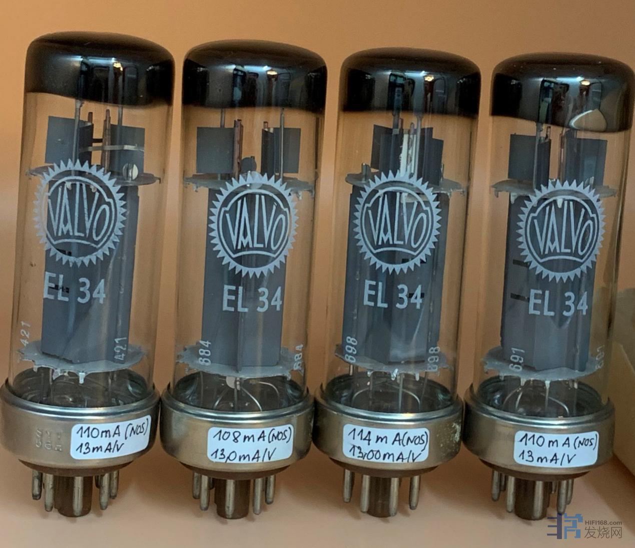 EL34/6CA7:大八脚的管基,五极管的结构。单管单端输出功率10W左右,推挽35W左右,这个功率被誉为胆机的黄金功率,推动大部分中灵敏度音箱可以胜任。这个欧洲名管在盛行时几乎风靡全球。由于音色好,功率稍大,使用EL34的古董胆机多不胜数,大名鼎鼎的ALTEL1568A/1569A、MARANTZ8B/9、DYNACO ST70……等等;现代胆机MANLEY 250/MANLEY 77每个声道使用十只EL34并联推挽。在众多的EL34当中,铁座PHILIPS产和铁座TELEFUNKEN产的最为珍贵!总体来说EL34表现清新亮丽、细腻圆润。