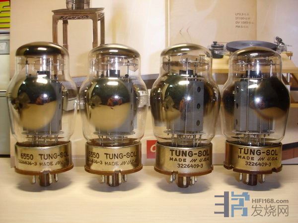 KT88/6550A:大八脚的管基,束射四极管结构,单管单端输出功率约13W左右,推挽输出可以达到100W。KT88最好的是英国GEC产的,6550A则是美国TUNG-SOL产的最好。古董名器Mcintosh MC275每声道使用一对,现代名器Menley 88每声道用5对KT88,UL模式下输出功率达到274W。这个管子声音大气、低频恢宏雄壮。大功率带来的优势是可以轻松驾驭现代的低灵敏度音箱。