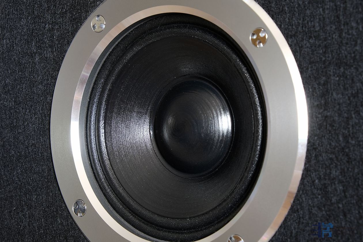 500 Hz 的中频范围由一个 13 厘米的中音驱动器负责,该驱动器的音盆由轻质浸渍纸制成。它的悬挂系统不是横截面为单个半圆的传统橡胶折环,而是由一个类似手风琴的双层并列折绕。振膜由无磁滞钛合金音圈驱动,极片上有一个铜感应短路帽,以确保驱动器的高速度和线性度。磁铁本身是一块坚固的通风钕圆形磁铁。所有这些都安装在由铝镁合计框体中。