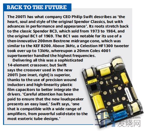 回到未来 200Ti拥有公司CEO Philip Swift所描述的“初版Spendor Classics 的核心、灵魂和风格,但在性能和外观上有所进步”。它的根源可以追溯到1973年至1984年销售的经典Spendor BC3 和1969年的初版BC1。BC1以使用当时创新的200mm Bextrene中音锥盆而闻名,该锥盆类似于KEF B200。在3kHz以上,Celestion HF1300高音单元接管了高达13kHz的频率,随后20mm Coles 4001超高音单元来处理最高频率。
