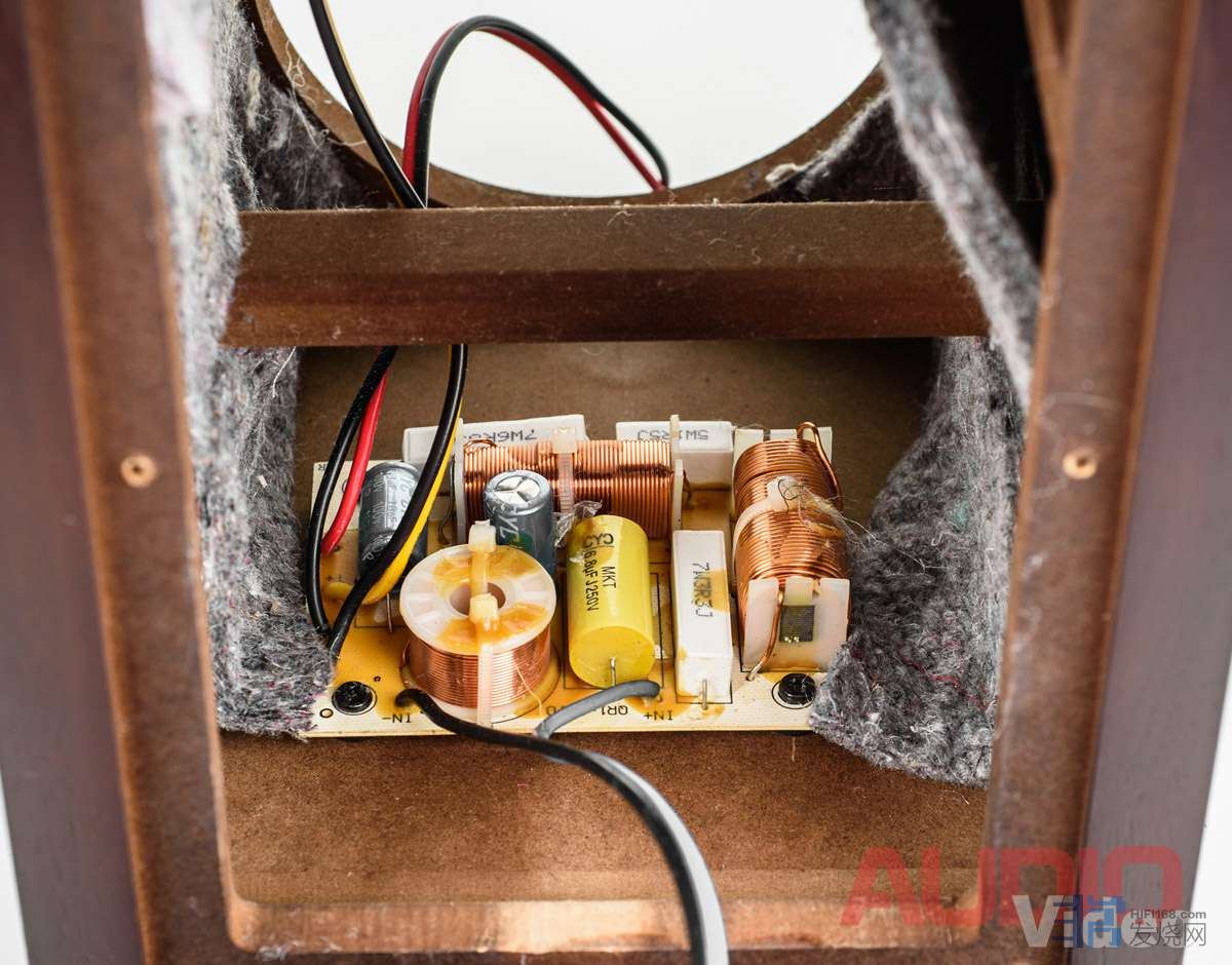 分频器被放置在箱体的底部。它由九个元件组成:三个金属陶瓷电阻器、三个线圈、一个聚丙烯和两个电解电容器。