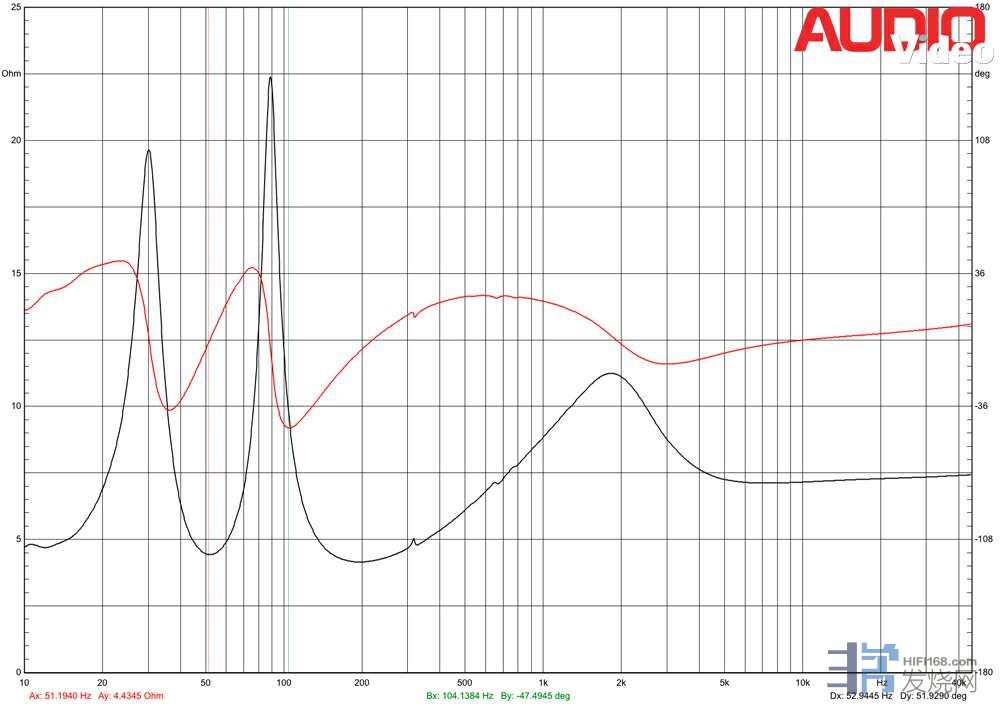 根据Audiovector标称,我们面对的是一款4欧姆的负载,这是一种“过度的可靠性”。事实上,阻抗模量的最小值略高于4Ω(更准确地说:4.15Ω),在大约190Hz时。从350赫兹开始一直到频段的边缘,阻抗模量没有下降到5Ω以下,这可以成功地认为是标称的。电相角不值得关注,峰值-47°与最小阻抗值不相关。两张图中317赫兹和倍频处可见的失真表明存在箱体共振。