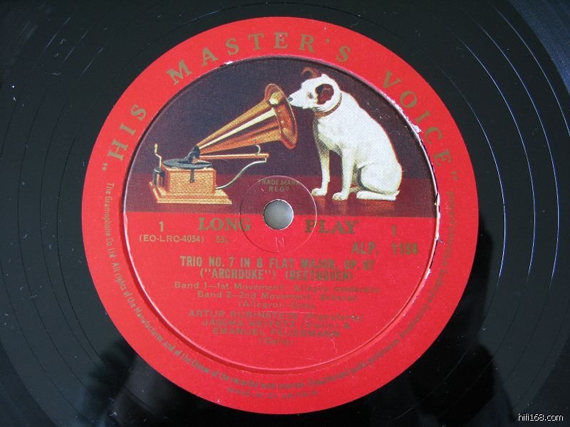 告别“CD世界”,开始进入“黑胶时代”,这个转变,是我没想到的!周末淘到我的第一张黑胶唱片——EMI公司出的海飞兹、鲁宾斯坦、费尔曼合作的贝多芬“大公”三重奏,英国产,收之前对于黑胶版本的情况完全不了解,只是凭感觉买,回家找了些黑胶版本方面的一些资料,知道这张唱片是EMI公司所谓半月狗的早期单声道版本,唱片编号是ALP1184,盘芯边上刻的字母是EO-LRC-4034-1N,日本唱片艺术还评为最佳名盘。按照有的资料介绍,看起来似乎是头版的,实在拿不准,请了解的朋友鉴定一下这张唱片的版本,从中也可以向各位学习些黑胶版本方面的知识,也让大家和我一起分享玩黑胶的乐趣,呵呵!