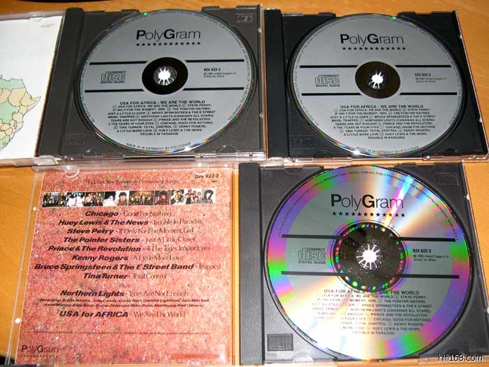 WE ARE THE WORLD: USA for AFRICA的CD也存在版次问题。目前大家在市面上碰到的二手可能大多是90年代初由美国宝丽金增发的胶圈版(IFPI L005),而实际上1985年发行的首版CD是所谓“满银版”(如图1所示),NO IFPI,内圈显示为“824 822-2 03%”,印刷品较再版颜色更浅一些(如图2所示),纸质更柔软些。因为85年市场上LP和卡带还是王道,所以这版CD发行量很少。尽管首版CD的盘芯上印着MADE IN U.S.A.,但事实上这些CD光盘全是在西德压制的,当年美国国内还没什么光盘生产线呢。