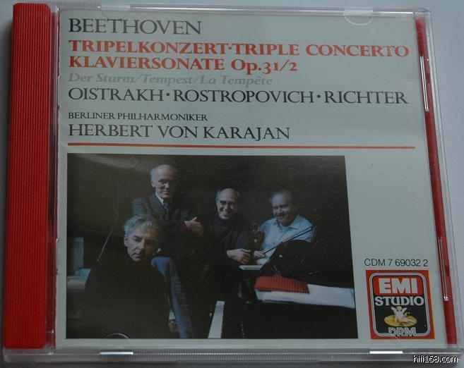 卡拉扬是当今乐坛公认的贝多芬作品权威权势者,这首作品的录音自然也是他的精彩之作。早在20世纪的60年代,卡拉扬就曾与前苏联的三位杰出艺术家大卫奥农斯特拉赫、罗斯特罗波维奇、里赫特为英国EMI唱片公司灌制过此曲,虽然这是一张再唱片史上很有影响力的录音,但是由于诸位大师都个性较强,合作起来虽然技术上表现得相当精彩,但彼此之间的音乐默契则略感有稍许的欠缺,于是卡拉扬便决定于1979年在德意志唱片公司再次录制此曲。