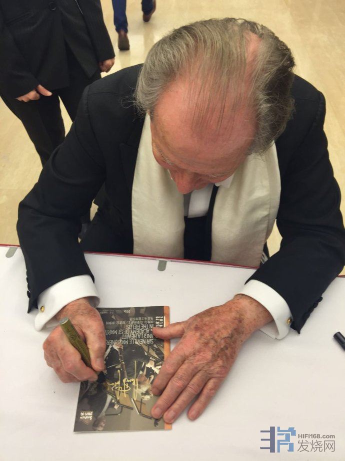 以前没有音乐会结束等签售的习惯,但这次的演出确实是太完美了,给我带来极大的愉悦,实在是抑制不住激动的心情,像追星的少男少女们一样排了长队和大师来个近距离的接触。92岁高龄的马里纳大师在接到我递过去的节目单时,像孩子般开心地笑了,带着满腔的爱意指着节目单封面上吹单簧管的人说,“This is my son.” 场面令人感动,但我当时却不知道说什么好,回家上网查了才知道,大师的儿子叫Andew Marriner,单簧管演奏家,伦敦交响乐团的单簧管首席