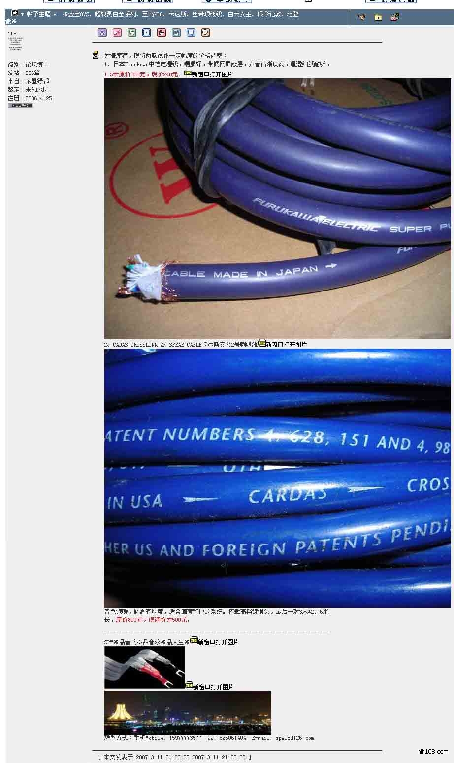 http://bbs.hifi168.com/showtopic-135448.aspx,截获本人于2006年12月份上传的如下一张范登豪红衣主教图片,经过几个回帖铺垫之后矛头直指spw卖了此假线给他,要本人给个交代。