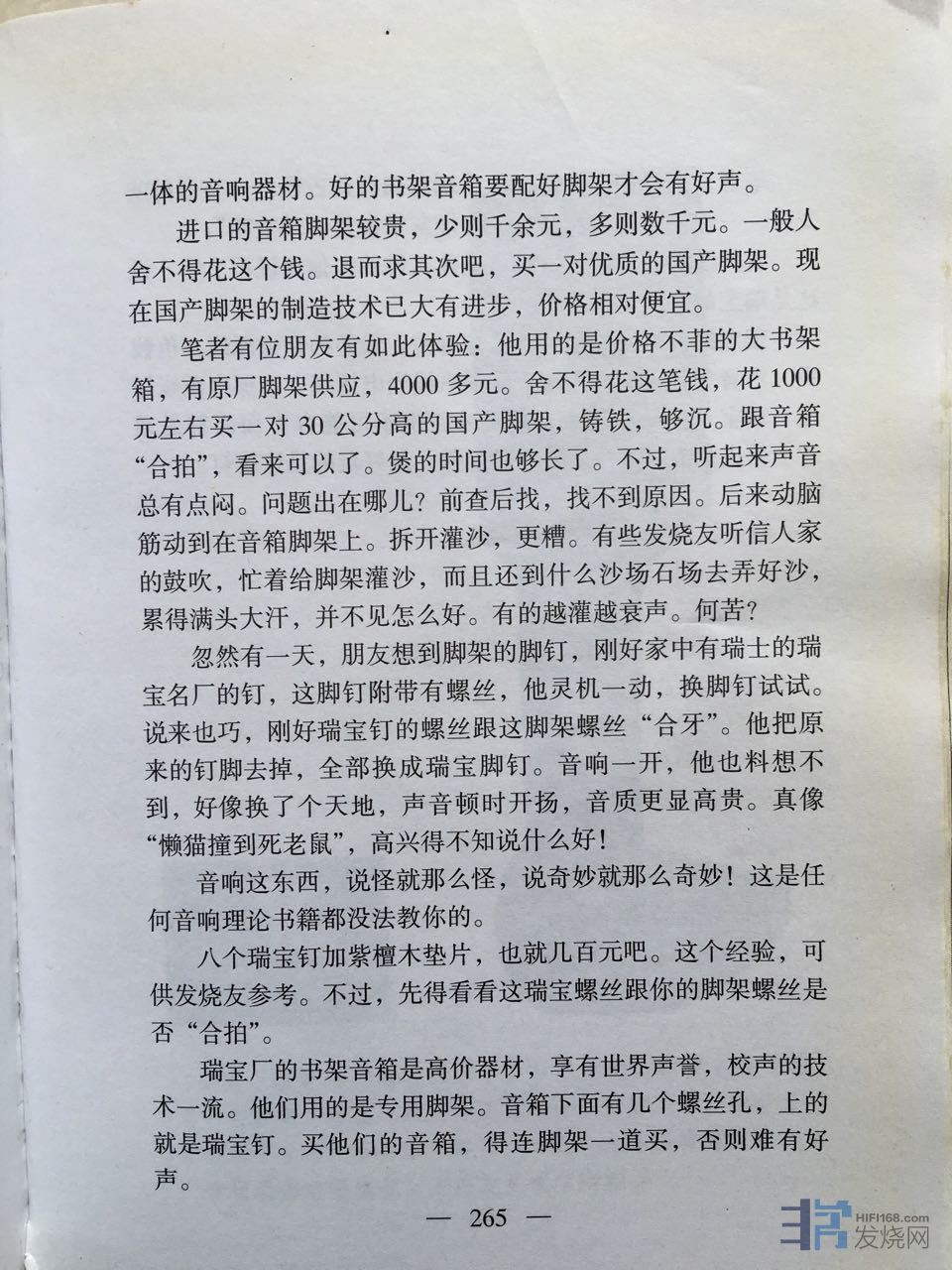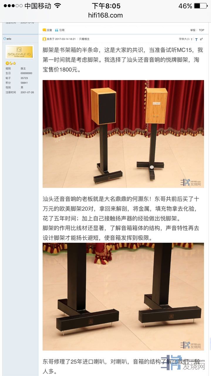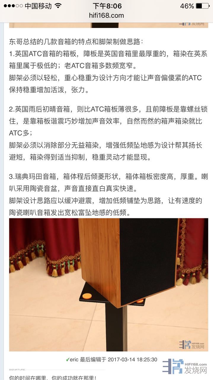 之前我用的黑武士脚架声音总是发闷,音场打不开,总感觉功放的功率不够,后来在音箱下面放了脚钉,声音才改善了发过帖子http://www.hifi168.com/bbs/showtopic-232798.aspx。这篇论文写到要树立这样的观点,脚架不只是垫材配件,是跟音箱连为一体的音响器材。这才是论文的精髓。那么我在音箱下放脚钉加脚架是属于垫材配件,要连为一体的音响器材,是不是要围绕着音箱去配制脚架,做一对和我的ATC11音箱设计理念合配的脚架。版主讲到悦牌脚架的几种音箱而不同的设计理念,与黑武士反复调换比试。以我的ATC11配制的悦牌脚架声最大的改变是低频下坠感明显,线条清晰。