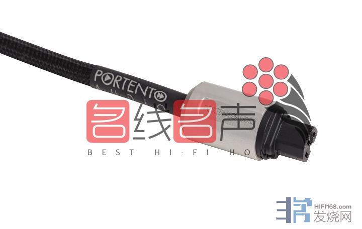 Musica电源线有着凝炼扎实的外观,以两端硕大银色全铝美标头尾插座为支点,由长1.5米直径15mm的黑网线身横跨相连,制作严谨务实而不奢华,插头外壳由直径39mm长56mm的纯铝打造,柱状表面铣切有一条宽12mm长42mm的平面,其上便是“PORTENTOAUDIO”厂牌LOGO英文字体镌刻,用作接线电流方向标记的三角形标记嵌刻于第一个字母“O”中,于细节中尽显设计巧思。头尾插座通体采用磨砂处理,呈现哑光亮银的色泽,极具金属质感,铝制外壳除了可以防止锈蚀还能形成强力屏蔽,确保电源线路寂静无染。插头接触端子全部采用特殊镀金处理,有着远低于普通镀层的接触电阻。