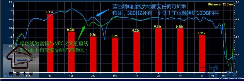 空间为5个面深度声学处理,唯有地面只有妥协维持大硬光面存在;音箱为前右音箱,MIC放置于皇帝位,MIC离音箱距离2.4米,蓝色频响曲线为地面无任何可扩散物体,绿色线为音箱与MIC之间的直线的地面上有放置反射扩散物体;蓝色线可以看出380HZ处有一个低于主体频响约10DB的谷,绿色线因为有地面放置扩散物体,谷消失;
