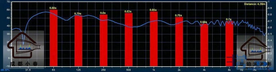 上面的的照片应该能看出是一个比较大的空间,大到在皇帝位的MIC都找不到侧墙的一次反射点,我们再来看一下实测数据:混响时间如预估的一样,125HZ-4K是0.66-0.79秒,因为空间大,一般烧友常说的镜子法则找第一反射点根本在皇帝位看不到镜子里出现主箱子,所以频响到没受到太多空间影响,表现得相当平直。 空间内说话大气洪亮,声如洪钟,一进入犹如孙悟空被封斗战圣佛瞬间说话有了回音。在这种大空间第一次反射点都找不着边的的情况下,小尺寸的扩散体反而不显得特别重要;