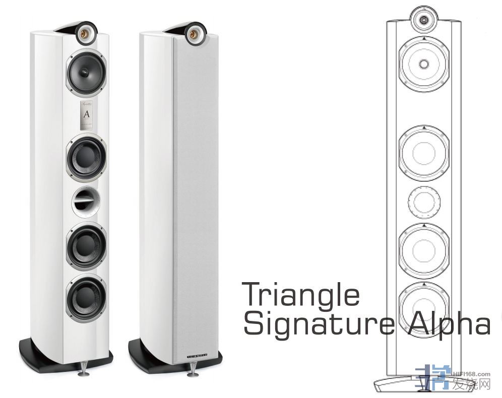 TriangleSignature"Alpha"的设计为三音路五单元,总高度为1.3公尺,属于瘦长型的音箱,箱体主要使用七块高密度的纤维板制作。高音单元使用TZ2550,这是以铝合金制成,并有新的相位锥和内部2mm的钛制圆球振膜,前方可以提供大表面积让高音频率扩散,近似于号角的做法,在效率上有良好的效果。在高音单元的后方空气腔室也比以往更佳,提供更好的能量吸收能力,避免声波能量涌回影响声音,让声音的纯净透明性、细节和保真度上都更加优异。