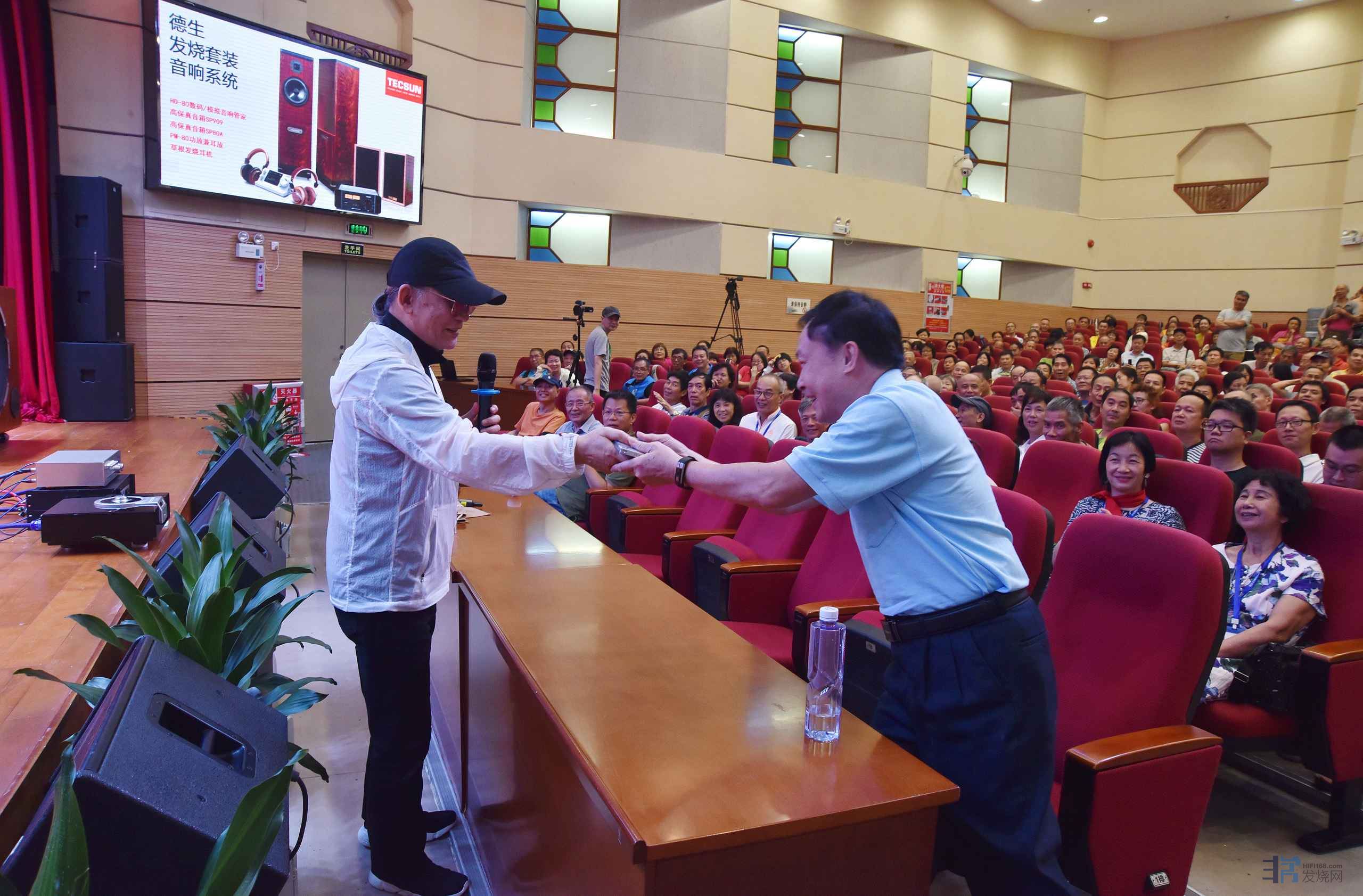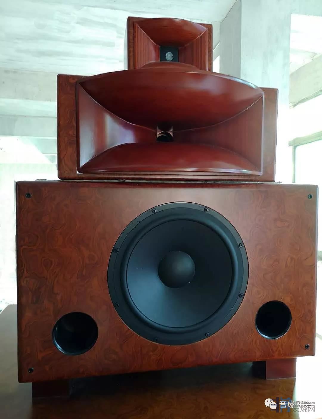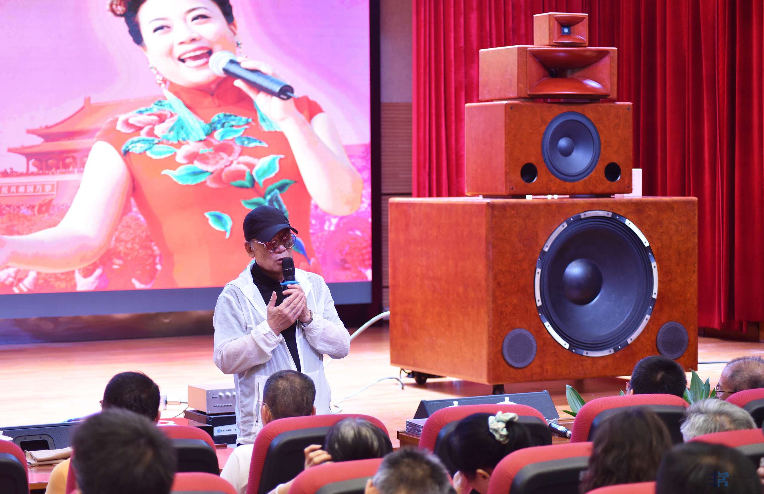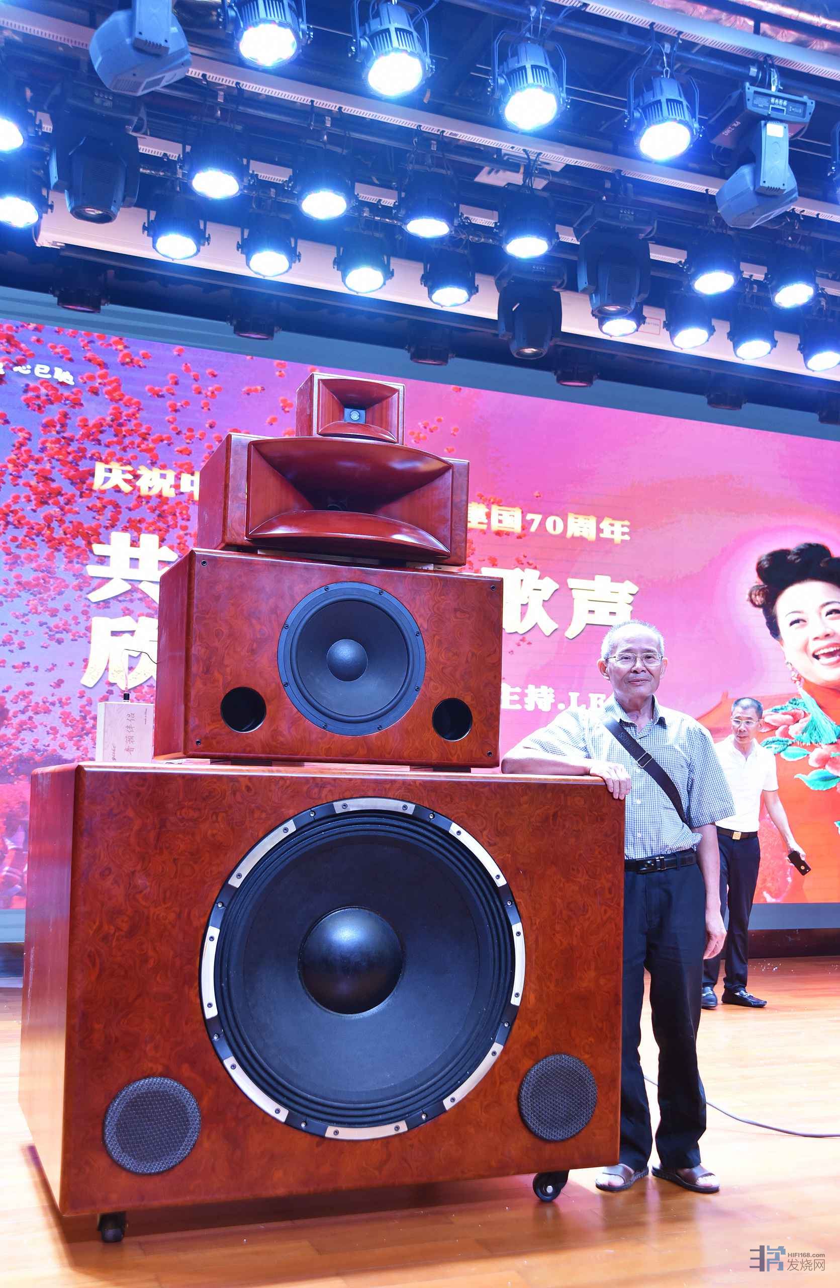 本场活动采用中国号角王李齐车最新设计制作的音响系统,以罕见的34吋超大低音单元为主,配合号角单元、陶瓷超高单元等,将4个独立箱体堆叠成一个全频音箱,一对音箱有8个独立单元。