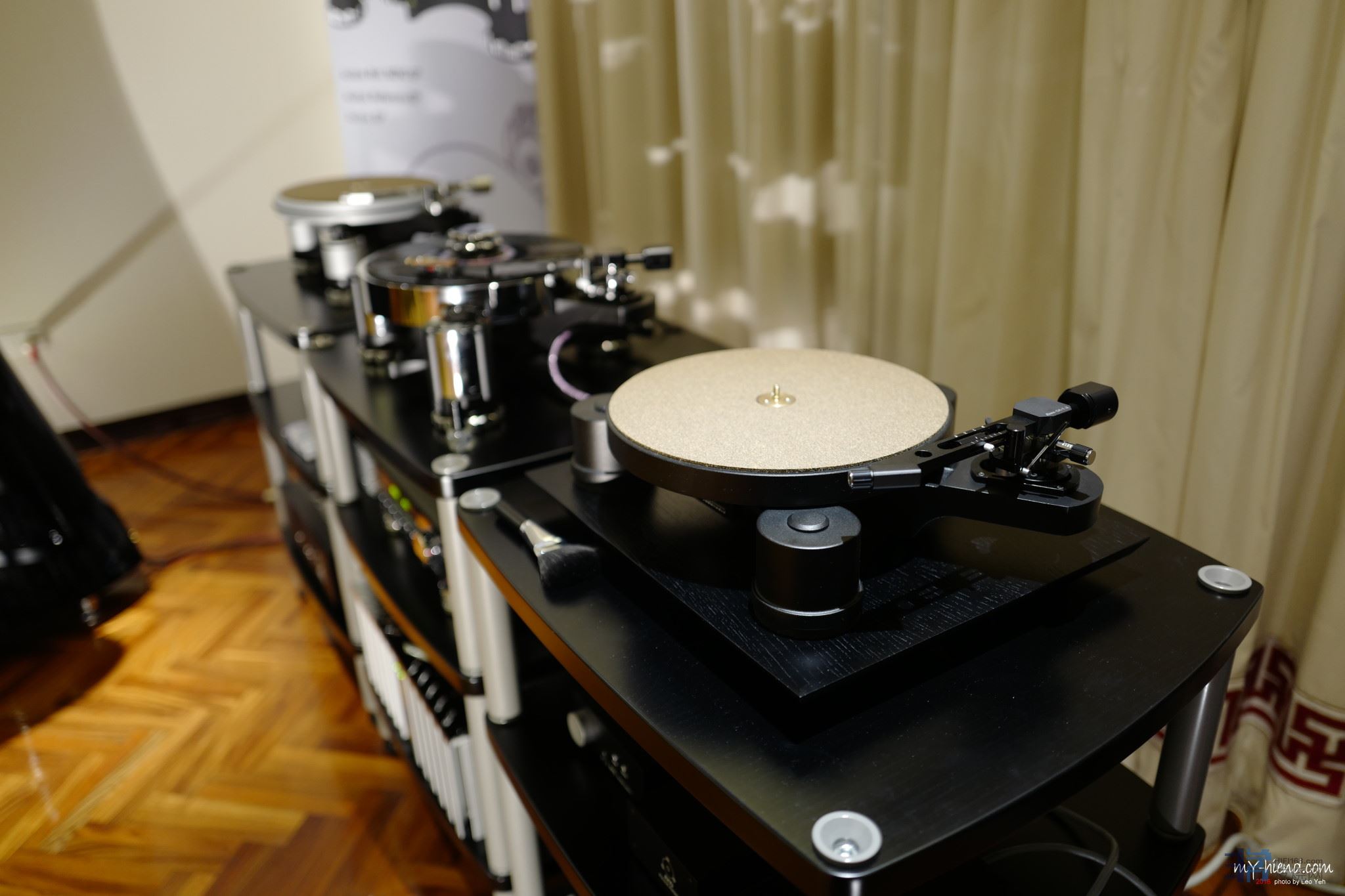 为了展现这样的差别,Conrad特地在音响展上展示了三台不同等级的黑胶唱盘,唱臂、唱头都一样,让大家了解唱盘等级声音的差别。