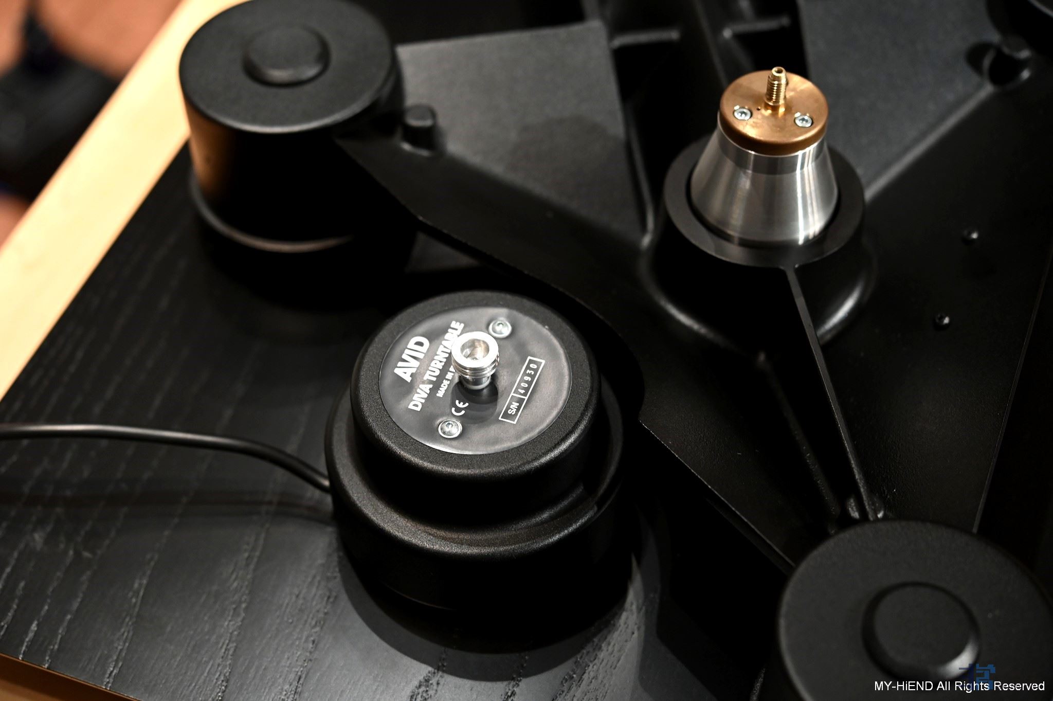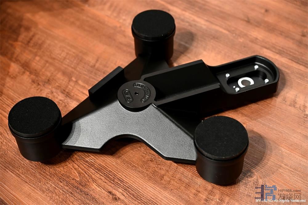 DIVA II SP的盘身,很坚固,使用铸造铝合金打造,其结构看得出来是经过特别设计的,不仅要稳还要有消除震动功能,转盘轴心就安装在这底座上,可将唱片与转盘上的机械震动经由唱盘底座有效地导出多余的震动能量,在三个支撑底柱还加上了AVID三层三点Elastomer抑震脚垫。▼