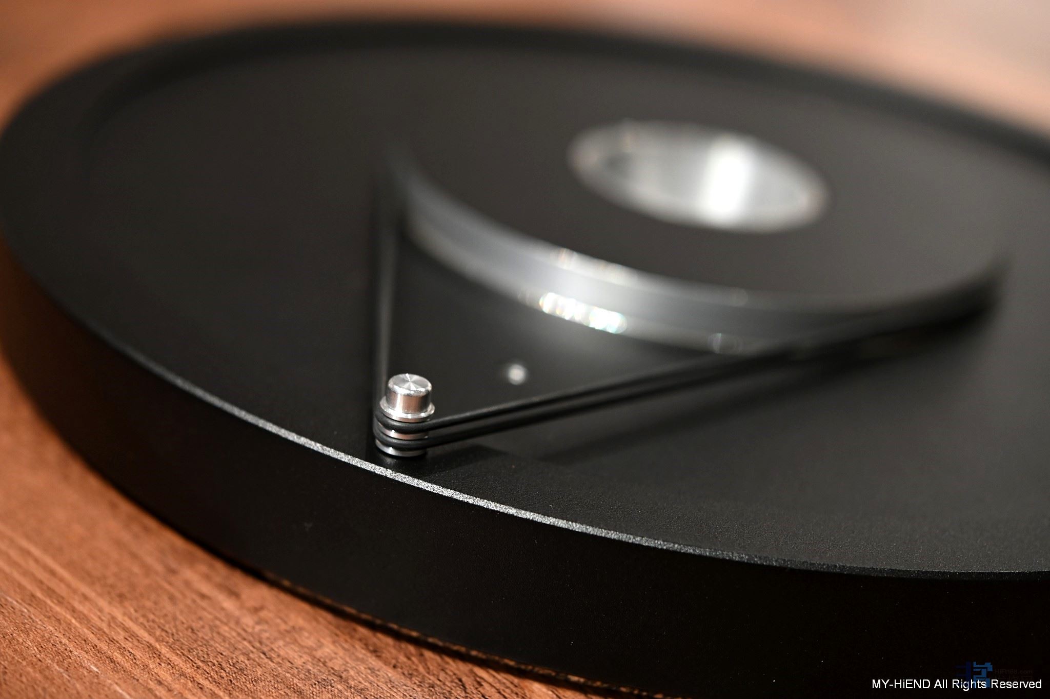 再将带动转盘的不锈钢轴套入承轴,要轻轻小心地放入,否则会伤到轴心,装好后试着用手转动一下是否顺畅。上方的螺丝座是用来跟AVID唱片镇对应锁定的,没错,AVID的唱片镇是采锁式固定的。▼
