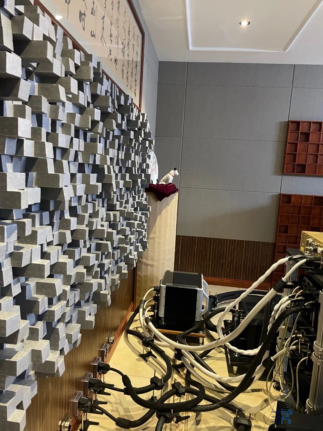 听音室宽4.8米、长8.7米、高3.2米,音箱正上方设计成了喇叭口造型,便于能量聚集。
