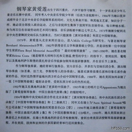 同是胡炳旭指挥中央交响乐团,由英国ASV唱片公司出版,录音相当出色。此碟包装虽貌不惊人,音效却令人刮目。HIFI性高是其次,最重要的是,它能让我听得感动。黄爱莲的演奏也与殷承宗一样,带有一股铮铮雄伟的中华民族之气概,这是前面几张——艾斯坦、郎朗、范聪他们演绎不出的境界。虽然黄爱莲的演绎诠释不及殷承宗的权威,但她表现“黄河母亲”的情怀更细腻,黄河母亲就象是一位历经沧桑、威武不屈的英雄母亲。当听她弹奏起“东方红”时,一股积蓄的激情顿作激动的热泪,盈眶而流,令我情不自禁地热烈鼓掌起来。
