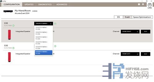接着选择Exakt后可以看到连上线的音箱,我们使用的是530,会自动抓取机型和机号。然后再中央的地方因为530有不同的外层布料包覆,一共有六种不同材质的布料,可以根据布料上的号码选择相对应的选项,声音效果会因此自动调整。在右侧则可设定音箱的左右声道配置。因为EXAKT技术是在器材内部,而且是全自动的调整,所以这边仅要确认音箱型号是否正确以及左右声道的设定就可以了,并没有其他的选项。也就是说选择这项产品时,不需要任何繁杂的设定就可以享受精准自然的音乐。