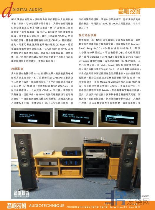 我得强调一点,N100只负责输出音源而没有解码,最终声音是否甜美很视乎解码器质素,这次测试利用Marantz SA-KI Ruby SACD / CD播放机的USB输入,取其大小通吃的解码能力,可自由播放DSD或其他高清音源,连同 Marantz PM-KI Ruby 扩音机及 Sonus Faber Olympica II 音箱开声,首先测试播放TIDAL的表现,上文已有提及到,在Melco Music HD点播歌曲是很爽,所以用户的操作感受先给它50分,然后是点播的流畅度,以我近数月不停测试这类产品的经验来说,它的反应是相当提神,甚少的延迟加上从无出错便值得再加10分,至于播放效果,由于Melco和Marantz都未采纳MQA技术,所以串流效果顶多达到48kHz,今时不同往日,只要串流的档案未高于96kHz,都不会导致声音断接,因此,无论我如何从数十张专辑中随意点播是没问题,话虽如此,歌曲的讯息量,例如低频会否软弱乏力,人声够不够滑,又或是声音是否有局促感觉,这些现象除了受到路由器及网线影响之外,也与播放器的接收处理有关。就N100的表现来说,我可以吿诉读者,听TIDAL和撷取16bit/44.1kHz是相差不远,本次测试我用的网线规格是Cat 5e,而且没加上抗噪滤波器,声音理应充满沙石,实情却反常人声滑溜不在话下,整体更没有压缩感。