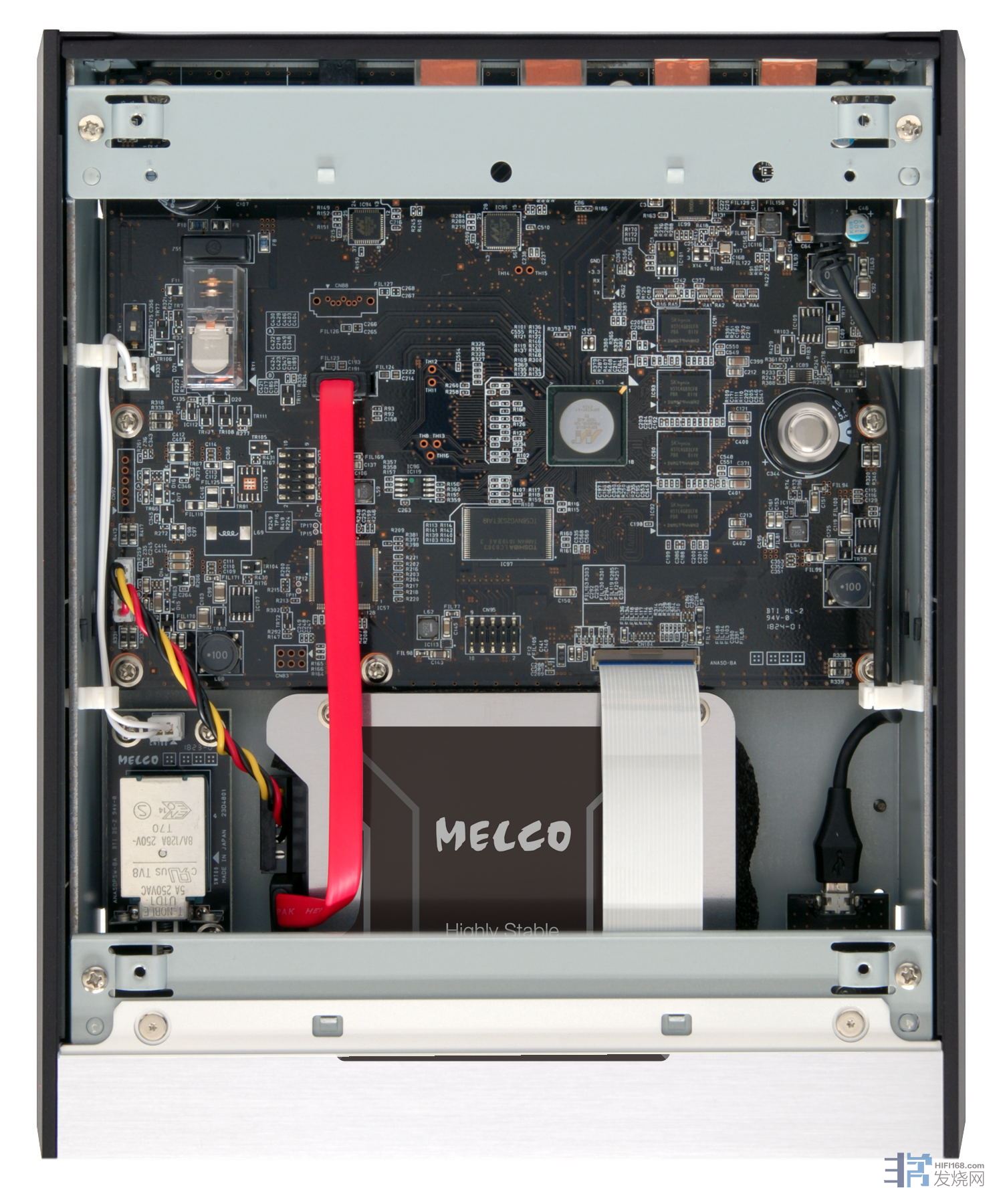 在介绍N100的玩法之前,先简介它的机体构造,这是俗称为半部机的尺寸,即是体积只有标准器材的一半,正因体积细小,各部份线路只能平均占用机箱空间,于是供电便用了外置小火牛,而机内线路除了必需具备的电子元件及数码芯片之外,还有用作储存音乐的2.5吋 2TB硬盘。