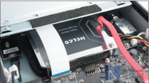 通常硬盘工作时是会产生出震动,为解决问题,厂方使用了2mm厚钢片制成机箱,配上铝合金前面板及机顶盖,利用不同金属物料的谐振点来抵消硬盘震动,另外,厂方宣称硬盘具有高稳定防震功能,但就没有具体说明构造,就我观察机内的布局,明显看见硬盘的位置与线路板是有相隔空间,其次是硬盘收藏在一个金属壳内,这部分是紧锁到机箱底板,借以固定方式减少产生出的震动,相信这就是所谓的防震吧!