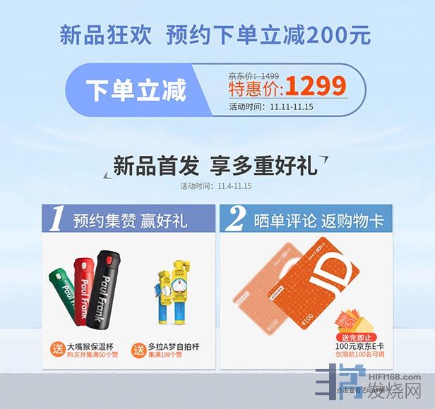 预约抢购期间,11月4日~15日,您预购后集满50赞可获赠大嘴猴保温杯,集满198赞可获赠哆啦A梦自拍杆。11月11日~15日,还可领取200元金额立减优惠券。此外,购买后进行图文晒单,前100名更将获赠100元京东E卡,多重好礼机会难得!