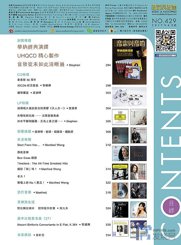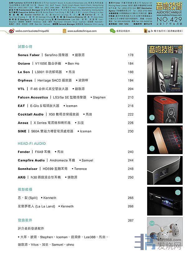 今期封面專題由披頭、馬田、大草評論 Albedo Audio Alecta揚聲器,大草、梁錦暉、馬田直擊慕尼黑音展,其他評論文章包括:Sonus Faber Serafino揚聲器 、Octave V110SE膽合併機、Le Son LS001串流解碼器、Orpheus Heritage SACD播放器、VTL IT-85合併式真空管放大器 、Falcon Acoustics LS3/5a SE監聽揚聲器 、EAT E-Glo S唱頭放大器 、Cocktail Audio X50 數碼音樂播放器、Fender FXA9耳機 、Campfire Audio Andromeda耳機、Sennheiser HD599 監聽耳筒 、AKG N30圈鐵混合型耳機 .....,詳細內容請參閱目錄。