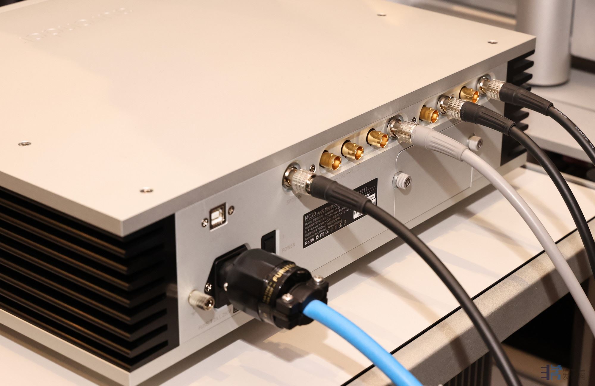 在背部Aurender MC20的10mHz同时备有50Ω、75Ω输出各两组,方便用户匹配各种器材,同时随机附有两款不同阻抗的BNC线,而两组OCXO也各有两个75Ω输出。