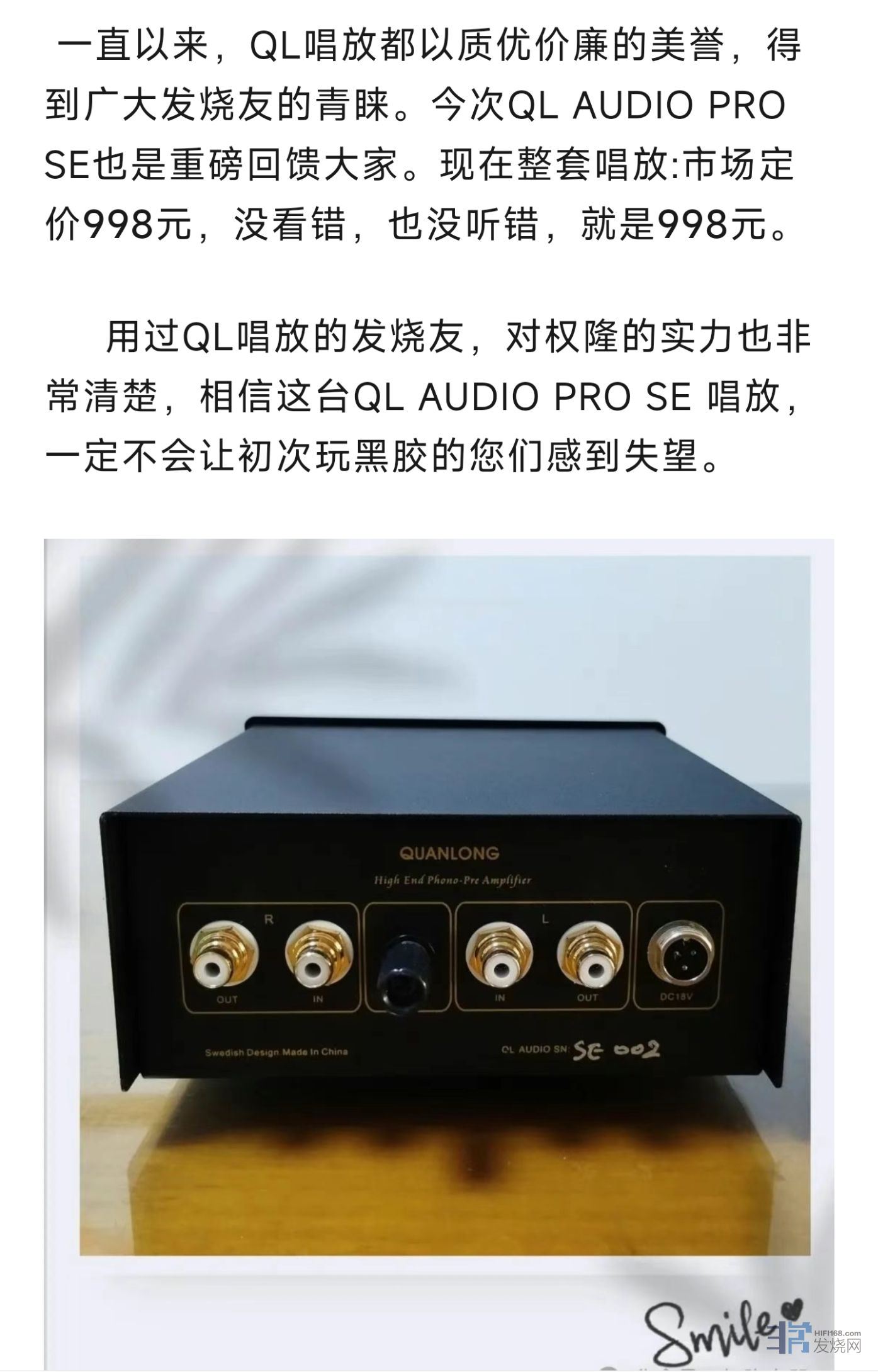 为感谢大家的支持,公司提供三套QL AUDIO PRO唱放进行618团购,原价¥3680,团购价¥2888,时间: 即日到6月18日,有兴趣的烧友,不要错过了!