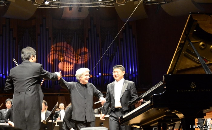 由于是第一次现场听钢琴协奏曲,我真是竖起耳朵,眼睛盯着钢琴家的手来听。因为是音乐厅的现场演奏,空间大,虽然是斯坦威的钢琴,也没有听某些钢琴录音中那么多的泛音和夸张的敲击琴键的富有“冲击力”的按键声。也许这部作品并不需这种夸赞的演绎手法。以我的观察,演奏家是很投入的,当是乐队演奏而未到钢琴声部时,他是闭着眼睛,身体微微地随着音乐摇晃,完成融入了作品之中。