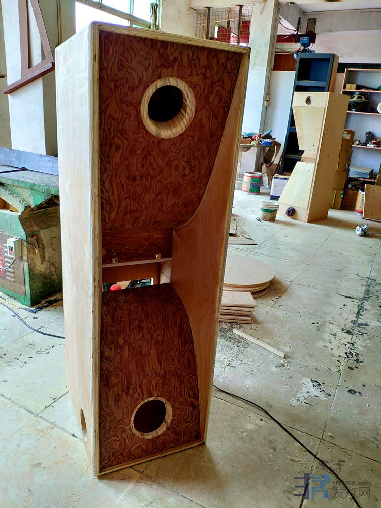 车间一角3:这只音箱是李老这次向我介绍的重点,箱体造型和制作都显得有些复杂,这样做下来,一对箱体成本不低吧: