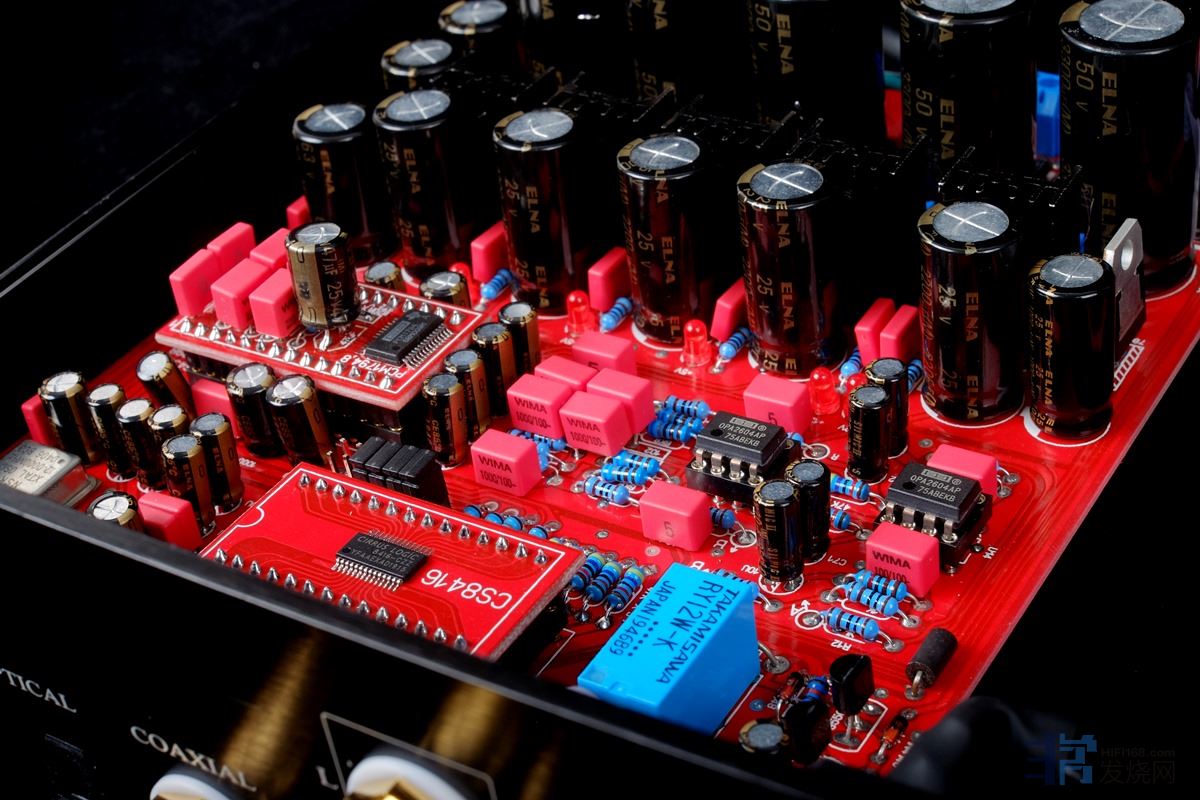 五、无瓶颈的电路用料:本解码电路严谨,用料到位,不偷工减料。由于电路信噪比高,因此采用直耦的工作方式,大幅度提高整机解析;电源采用60瓦环牛3000uf小电容并连,电阻采用1%精度的5环电阻,日本NSG高精度晶振,电解电容全部采用日本ELNA电容,非电解电容为德国WIMA红色电容;
