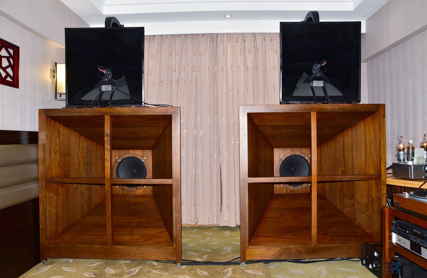 今年的展会入住位于海珠广场的广州华厦大酒店。其中亮点不少:器材方面,德国的汉诺瓦(Hanowa)是家实力雄厚的音响公司,近年才进入中国市场。这次参展,他们将家用和舞台器材都带来了。颁奖会和主场歌手分享会的大厅里就是一套汉诺瓦的TF20线阵,这套造型粗犷的音箱和其它舞台音响一样有着强有力的声压,以保证大厅的每个角落的听众都能清晰地听到声音。它不但在播放强音时气势逼人,同时在细节表现上也十分出色,弱音的气息与质感纤毫毕现,还原度直逼家用Hi-end。此外,Mercury(水星)音箱系统凭独具一格的外型,超卓的音色及备受追棒。该系统的主扬声器背面为全铝架支撑,没有箱体,使用了8个AMT气动式高音,一条48英寸(122公分)长的铝带中音,透过前后发声,利用听音环境后墙空间反射从而令音乐爱好者、音响发烧友在聆听过程中,体验到比只向前发声的传统喇叭获得更佳的“现场感”。再加上两只12英寸的主动外置超低音箱和MOON II系列超高音舞台声场扩展器,无论你是家居客厅还是沙龙会所,都能得到“舞台声场”的美好体验。