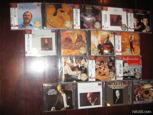 目前为止买入一百多张的SHM-CD,确实非常不错.其中DECCA公司的目前已经出了19张,我除了其中的3张外,其他喜欢的都已经买入.DG公司的除了去年11月出的几张没有买到外,今年出的几乎都已经买入(卡拉扬系列中,马勒由于不是全集所以没有买,指环应已经有了普通版,贝交有了63年的SACD,这三套没有购入);PHILPS的除小泽征耳的几张外,其他的大多数都已经购入,目前还有五张穆蒂的还在路上.伯恩斯坦系列除贝交和马勒(已经有了日版的SACD)外,其余都已经购入.