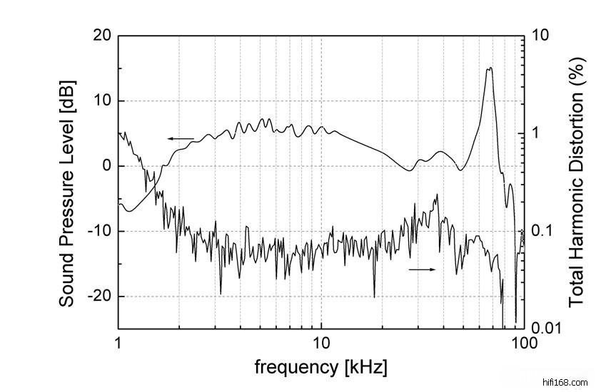 频响可谓非常雷人,所谓到100kHz的高音,其实从10kHz就滚降了,再往上就是剧烈谐振峰,在100kHz有响应而已。