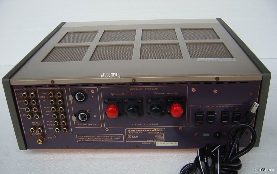 本店经营音响多年。信誉超群。所有货物都经精心挑选。如果商品不能让你满意。本店15天内包你退换!保修一年!(凯天音响部)是你最值得信赖的商家!是你无悔的选择! 日本著名影音器材MARANTZ(马兰士),诞生于1952年的美国,它和DENON被誉为世界两大名牌。五十多年来,马兰士 MARANTZ 为世界影音器材市场提供了许多高级、出色的影音器材,而受到专业人士垂青与赞誉。马兰士 MARANTZ 注重科技的发展和市场要求的更新,对产品的功能质量进行不断的改进和提升,在专业领域稳稳地占据着领导者的地位。MARANTZ经过多次的资源优化重组,现已成为日本最大的影音器材生产商之一! MARANTZ PM-99ES是属马兰士公司目前技术最高水准为最顶级的功放,其优美的工艺,相当让人心旷神怡,此机同样属甲类功放器,设计这更是给机器增加了平衡输入.机器内部全部采用OFC(无氧化铜)运输电路板。使它的音质传送达到尽善尽美!而音质。当然不用多说》声势如深山流水,静中有动,特有魅力。 此机器有9.5新,几乎全新,没有修过,没有摩过,如有PM99这机器难得,但如有这样成色更加难得,可说十年不得一见!