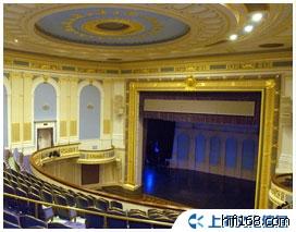 芝加哥Orchestra Hall(1891一1905),2582座,混响时间为1.3秒.为了解决视线问题,取消了厅内的侧向浅挑台;为了增加容星,建造了两层大挑台:池座有不高的升起:厅内处理手法明显地具有古典歌剧院的影响,但是演奏区和听音区仍处在同一空间中.演奏区的顶棚和听音区的项棚都连在一起做成向上倾斜,有利于一次声反射.厅内音质千涩,但清晰.