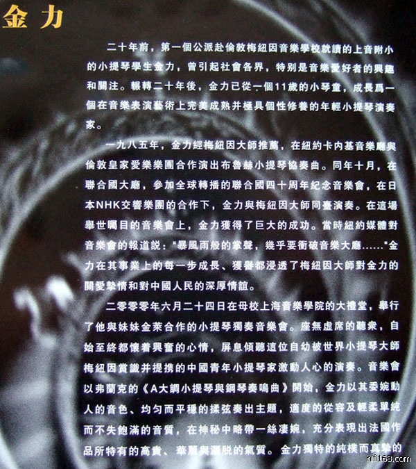 我从没研究过小提琴演奏,以前对这方面的知识和音乐也见识的很少,所以也没有什么特别专业的感言,只是觉得金力演奏的音乐从始至终都惯穿的很好。不论是悲伤的,还是高亢的;也不论是急促的,还是缓慢的,都衔接的很自然流畅,没有扎实的功底和精湛的演奏技巧,我想是不会给人这种感觉的。虽然不懂他演奏曲目的主题和内涵,但我也算是听得津津有味,因为金力是受到过世界著名音乐人士高度评价和肯定的,所以在享受他演奏的同时,也会油然而生一份民族自豪感。