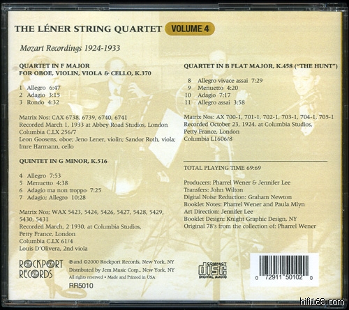 这张唱片是Mozart专辑,Léner SQ.表现出显著的纤细音色。在双簧管四重奏K.370中Leon Goosens(1897-1988,唱片印成Leon Goosens应该有误)表现得十分抢眼,虽然他温和的音色非常配合Léner的纤细,不过双簧管的声音始终漂浮在弦乐之上,Léner就像湖面的微波,Goosens是小舟。
